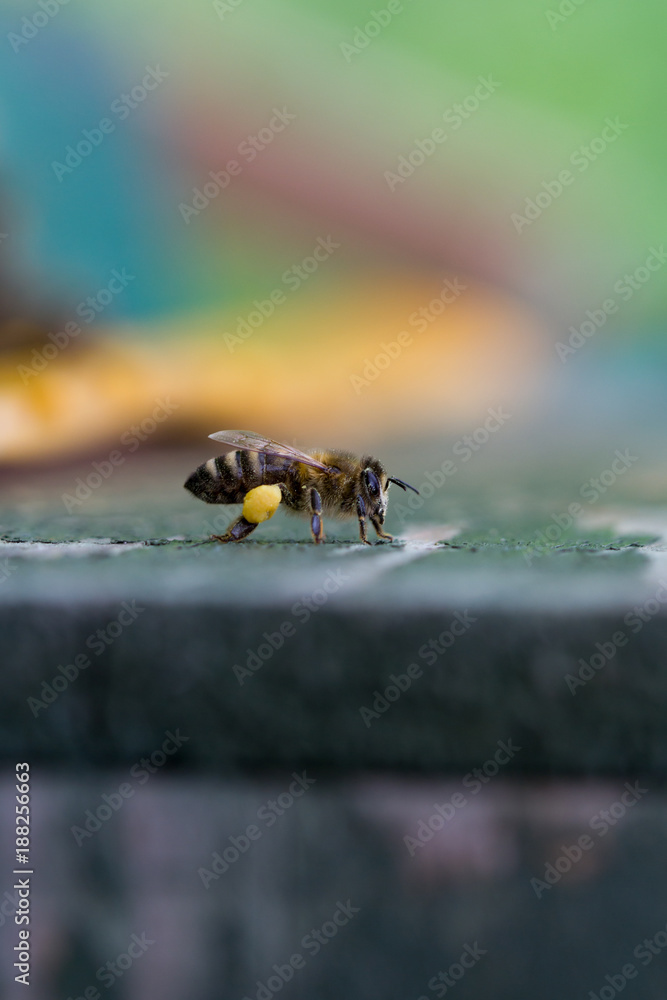 Bees in front of beehive