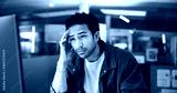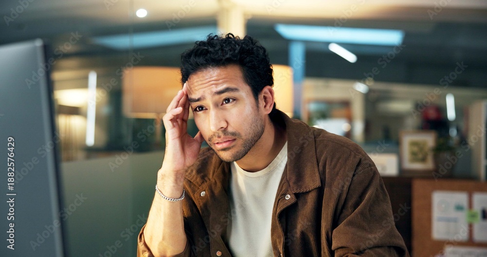Man, night and headache at computer for business, workload pressure and mistake in article. Journalist, stress and tech on office with research deadline, creative brain fog and fatigue with migraine