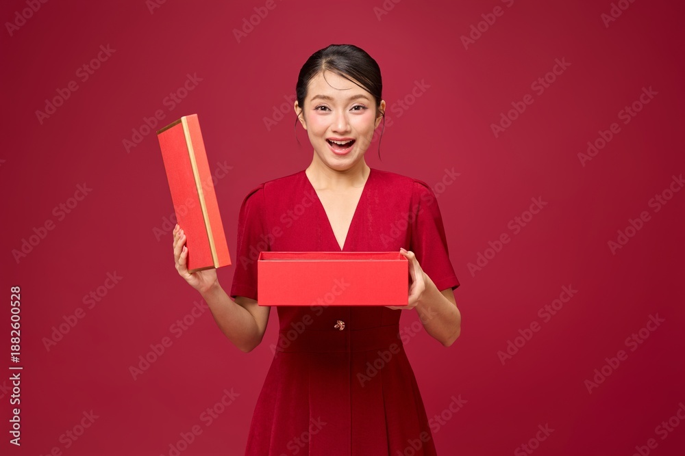 An asian woman with red dress on red background. A red gift box is presented clearly in this clean and focused New Year gifting portrait.