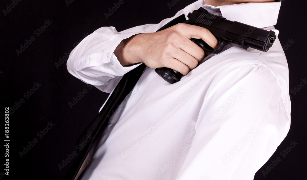 Man in black suit holding gun in hand. Secret agent, mafia, bodyguard concept.