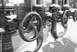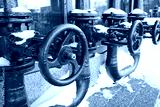 Red industrial gas pipes with valves covered in snow outdoors