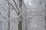 Snowcovered tree trunk standing amid frosty woods, rough bark textures highlighted by white accretion, peaceful cold landscape, sense of endurance and quiet shelter