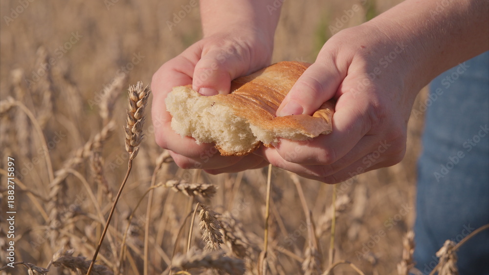 Hands Breaking Freshly Baked Bread in a Beautiful Wheat Field Under a Clear Blue Sky