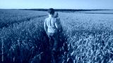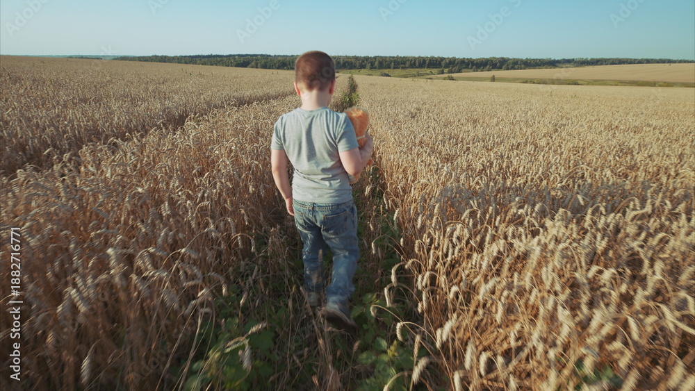 A young child is joyfully walking through a vast wheat field beneath a clear blue sky