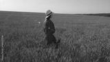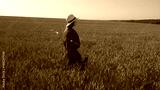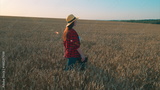 A woman gracefully walking through a vast golden wheat field as the sun sets in the sky