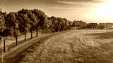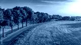 Bicycle lane road between trees aerial drone view from above, cycling lane for bikes, idyllic dutch spring landscape, typical countryside in Limburg, the Netherlands