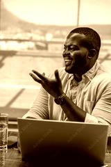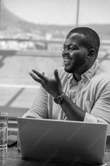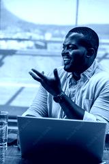 African american man speaking while gesturing at boardroom table with laptop, water, copy space