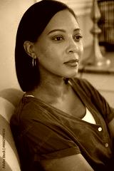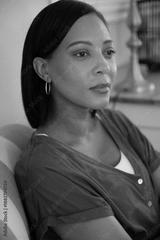 Hispanic woman sitting in armchair at home, gazing at lamp on console by bookshelf