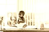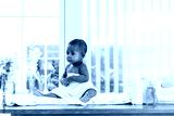 A baby wrapped in a towel sits on a changing table by a window, surrounded by baby care products in a bright, airy room.