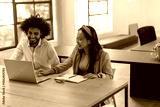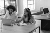 Diverse coworkers working at office desk with laptop, notebook, pen, eyeglasses, potted plant