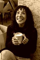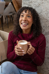 African american woman sitting against marble wall inside cafe, holding ceramic mug, smiling