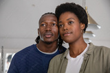 African american couple gazing off-camera at home with big windows and white, gold pendant lamps