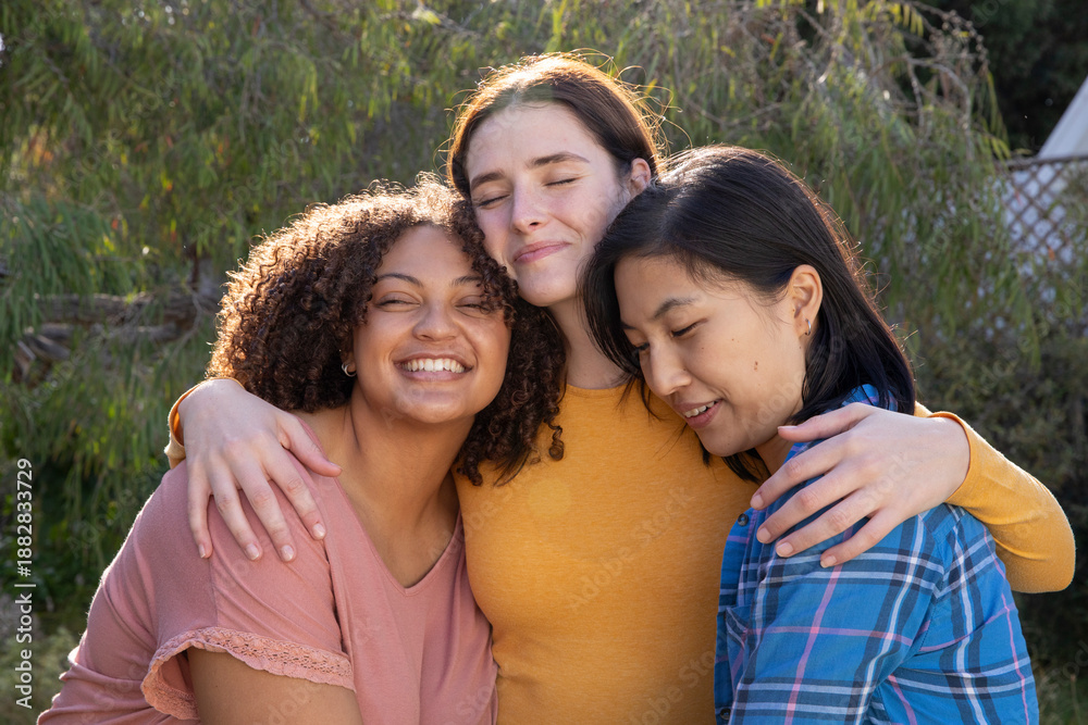 Diverse female friends hugging closely in backyard garden under sunny sky sharing friendship moment