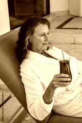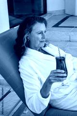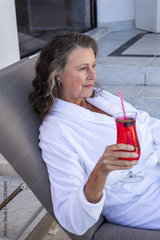 Senior woman wearing bathrobe reclining on lounge chair on patio holding glass with fruit cocktail