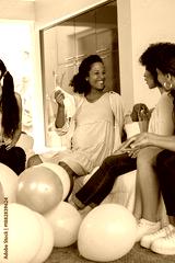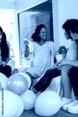 Diverse female friends sitting in living room at home examining baby bodysuit, pastel balloons