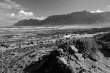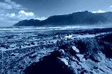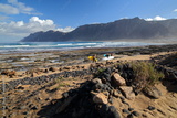 The rocky, volcanic and sandy beach in Caleta de Famara, Lanzarote, Canary Islands, Spain, with the cliffs of El Risco de Famara in the background and surfers with their surfboards in the foreground