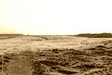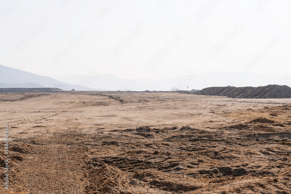 construction site with dirt road and barren land under clear sky, showing early stage infrastructure development and wide open space for future projects.
