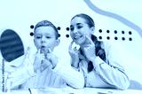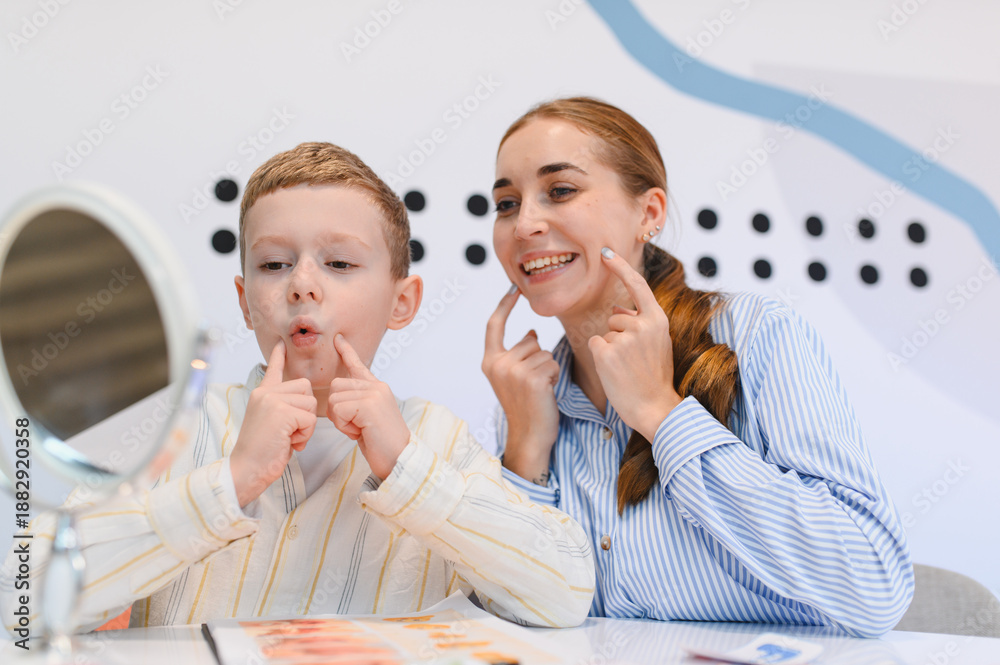 Child learning articulation exercises with speech therapist
