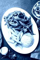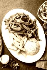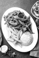Peruvian dish Lomo saltado - beef tenderloin with purple onion, yellow chili, tomatoes served on white plate, slate background