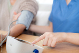Asian woman nurse measuring blood pressure senior patient, medical checking for hypertension monitoring, caregiver support elderly woman with arterial blood pressure device, routine health checkup.