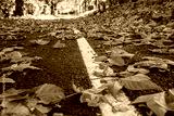 A low-angle close-up shot shows a white line on an asphalt path covered with fallen golden autumn leaves in a park.