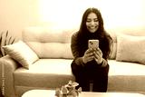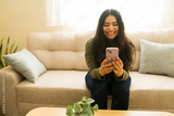Happy young woman smiling while using mobile phone on sofa, connecting online and relaxing at home