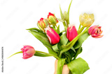 Closeup Spring bouquet of pink and yellow tulips in female hands, Springtime happiness, Easter religious symbolism, joyful spirit Easter, beauty of hyacinths in natural setting