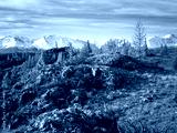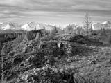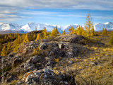 Snow covered Altai mountains in distance. Yellow autumn trees dot the rocky landscape. Clear blue sky above creates dramatic lighting.