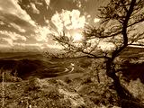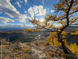 Sunlit autumn landscape in Altai with winding river snow capped mountains in distance rugged rocks and yellow trees create warm dramatic scene.