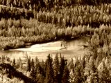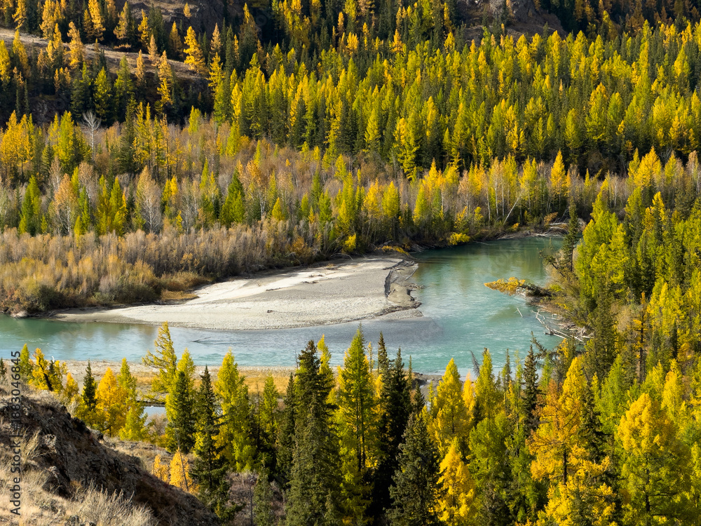 Autumn forest with golden yellow trees surrounds a bright turquoise river. Clear water reflects the autumn sky. Serene landscape perfect for nature travel and outdoor adventure.