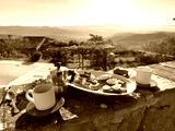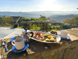 Outdoor breakfast with coffee cups moka pot toast eggs vegetables cake against a sunny hillside view.