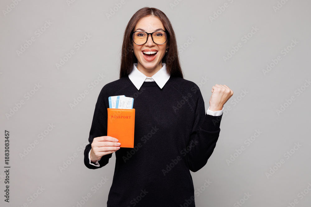 Traveler employee business woman lawyer in black clothes hold passport ticket isolated on plain grey background. Tourist travel abroad in free spare time rest getaway Air flight trip journey concept