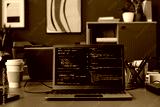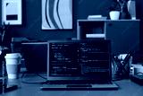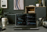 Laptop displaying programming code on screen positioned on office desk with takeaway coffee cups, smartphone, and stationery in modern workspace, no people visible