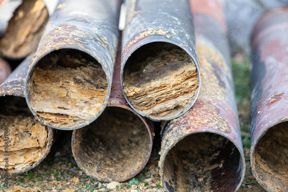 Gros plan sur l'intérieur de vieilles canalisations d’évacuation d'eau. Les tuyaux sont obstrués, leurs intérieurs sont remplis de couches de calcaire comme un millefeuille.