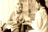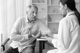 Senior male patient describing chest discomfort to female doctor during medical consultation, highlighting heart health and cardiovascular concerns