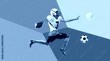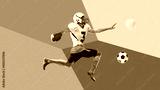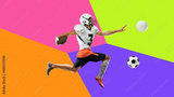 Expressive collage. American football player leaping through geometric space. Concept of professional sport advertising, bold marketing campaigns, modern athlete branding, dynamic poster design.