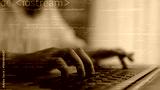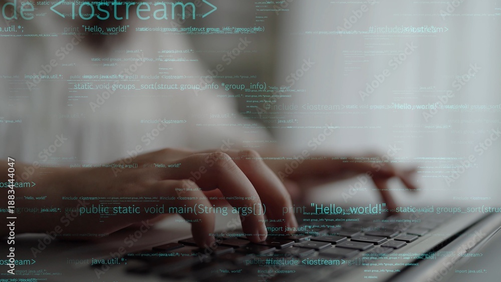 A focused individual types on a laptop keyboard, surrounded by digital code and data, representing modern programming and technology in a dynamic workspace setting. Xenic