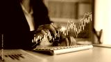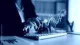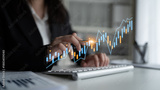 A business professional engages in financial analysis, utilizing technology to assess growth indicators through digital charts while working at a modern desk. Gantry