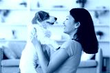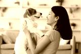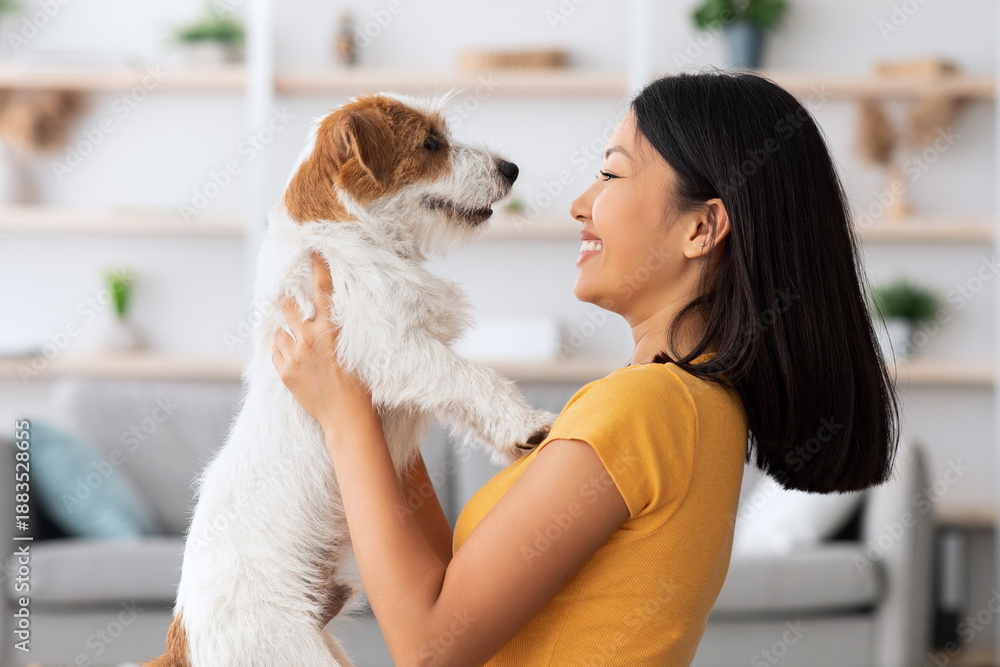Emotional young asian woman petting her cute dog at home, loving korean lady playing with fluffy jack russel terrier in living room, closeup portrait. People and dogs, pets adoption concept
