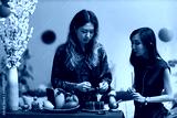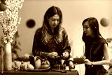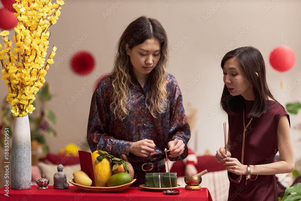 Two young adult Asian women preparing traditional offerings and lighting incense at decorated table with fruits and Tet holiday items, engaging in cultural celebration ritual together