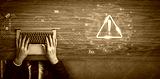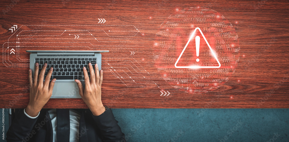 A user types on a laptop amidst a digital warning sign, showcasing the importance of cybersecurity awareness and modern safety measures in the digital workspace. Gantry