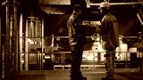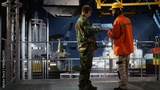 Security officer in camouflage uniform monitors offshore drilling operation, using radio communication for intelligence coordination and threat detection in maritime environments.