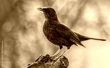 Female blackbird on a perch, golden hour light.