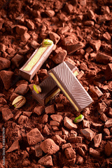 Tasty Dubai chocolate on chocolate bar with cocoa powder.