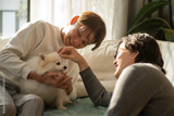 asian Happy Gay Couple Play with Their Dog,Gorgeous white Pomeranian at Home Apartment.Lgbtq,Boyfriends Tease,Pet and Scratch Super Happy Doggy,lifestyle,freedom,love,Have Fun in the Living Room Flat.