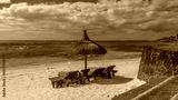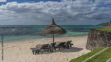 A row of sun loungers under a straw umbrella on a tropical beach. Shadows, footprints in the white sand. Turquoise ocean. Blue sky, clouds.Mauritius. Belle Mare. Resort. Hotel.