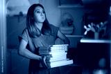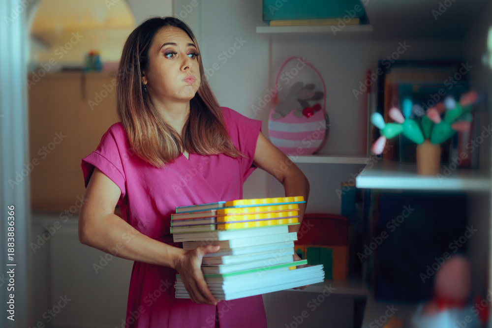 Tired Housewife Tidies Up and Carries Heavy Books to the Shelves. Exhausted woman strains under the weight of heavy textbooks as she restores order to her shelves
