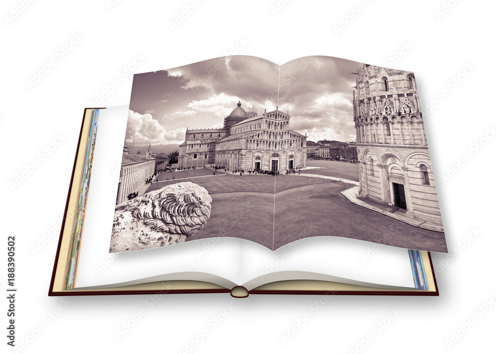 Opened photo book of the famous italian square called "The square of Miracles photographed from an unusual point of view.