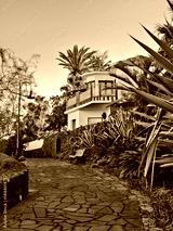 Romantic cobblestone alley between old houses and tropical vegetation in beautiful light, on the island of La Palma