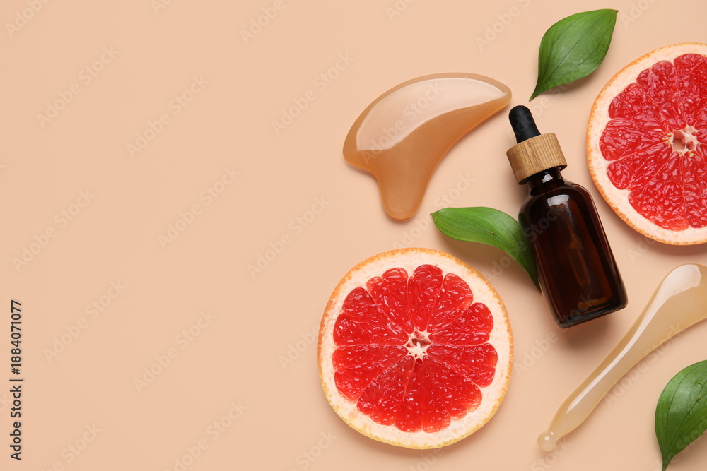 Composition with bottle of cosmetic product, facial massage tools and slices of grapefruit on beige background, closeup